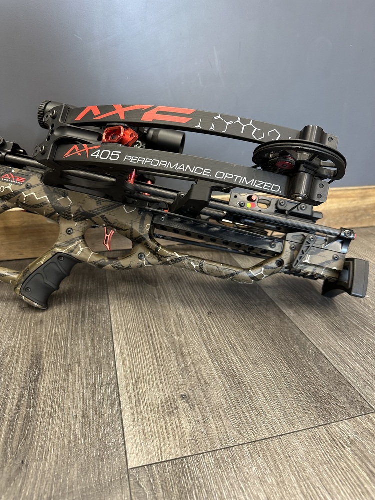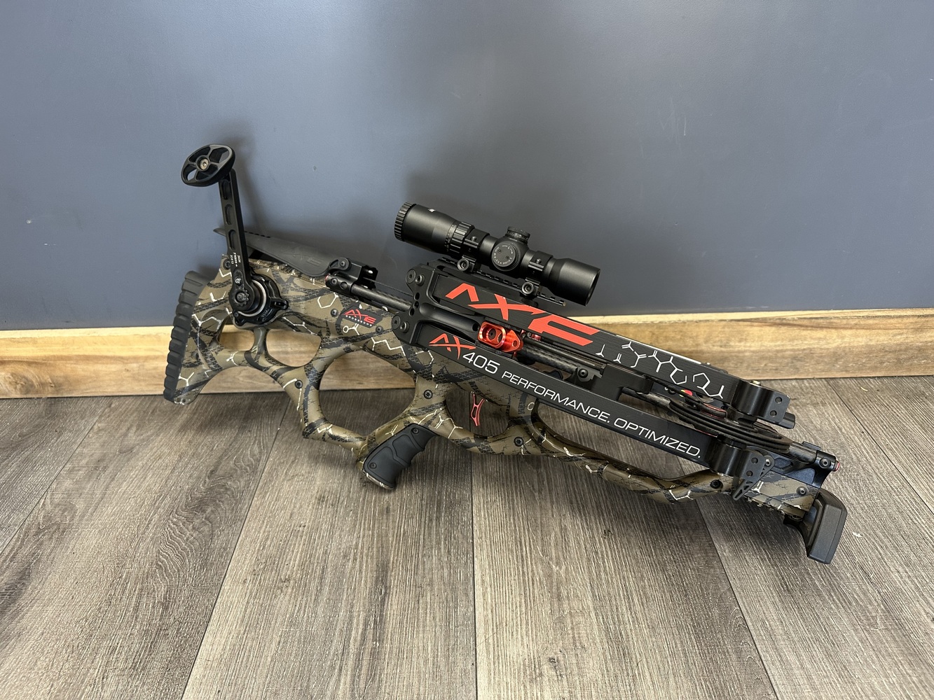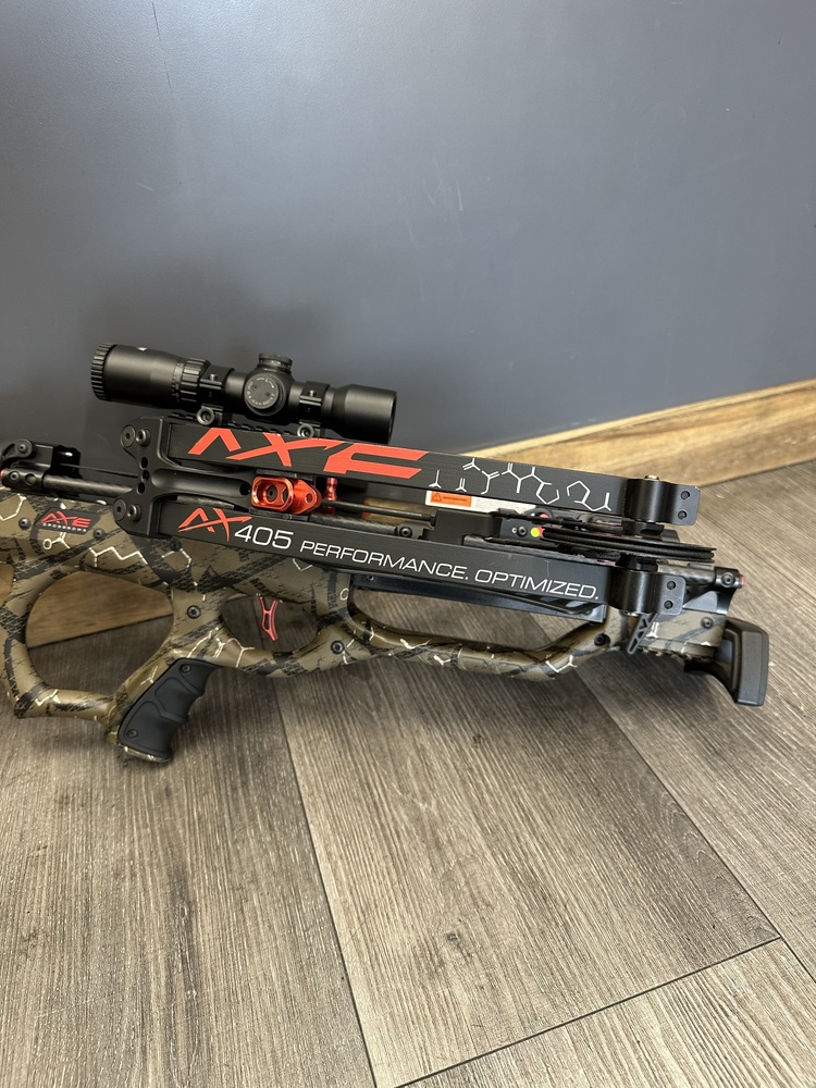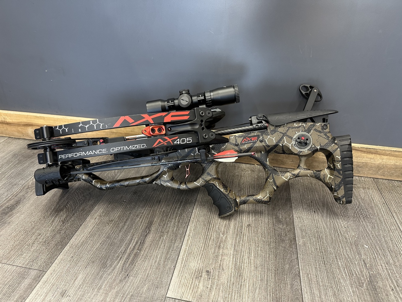 For sale, we have an Axe AX405 Crossbow Package with Scope. The crossbow is in good condition with some signs of use as shown in the pictures. Comes with 1 arrow. The scope is missing 2 of the adustment caps as shown in the pictures. If you have any questions before purchasing pleas elet us know. (134476)(CXX)