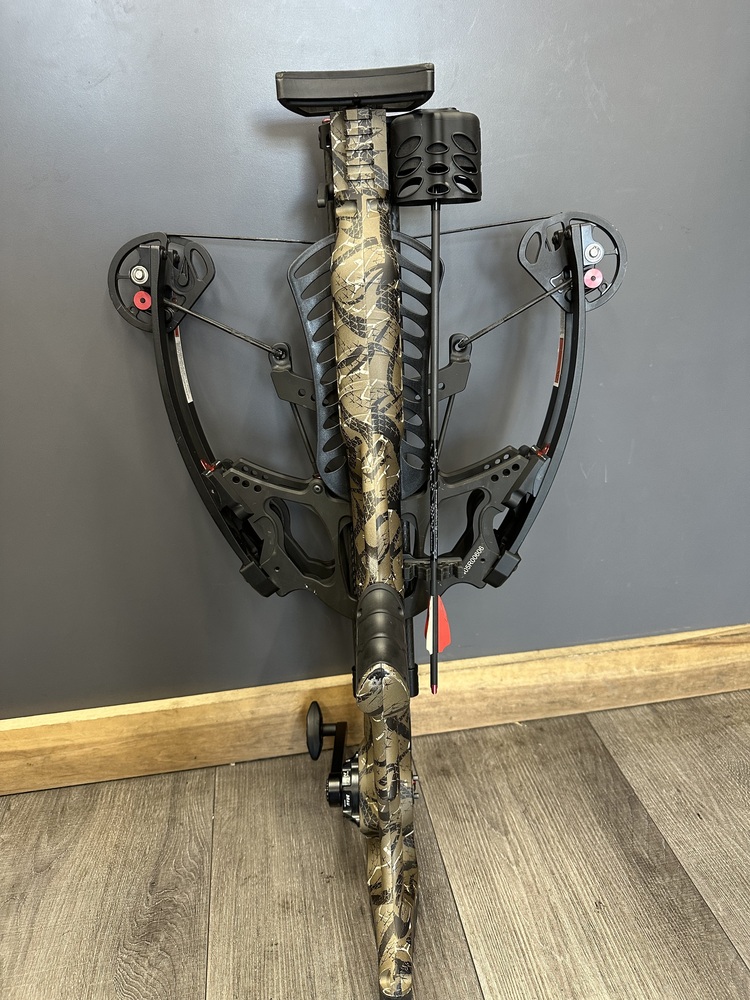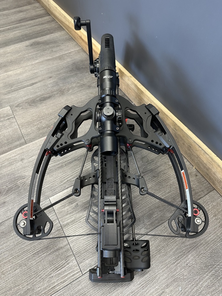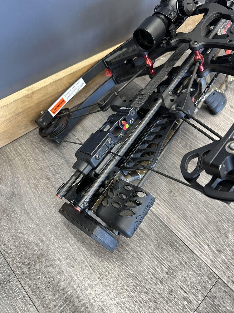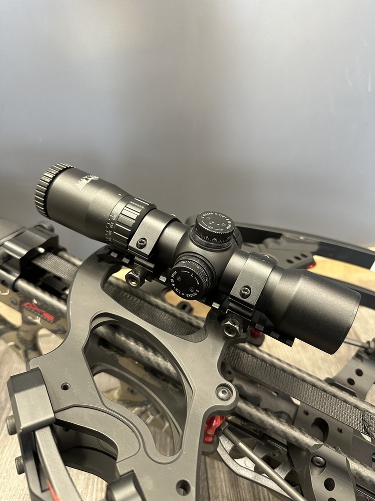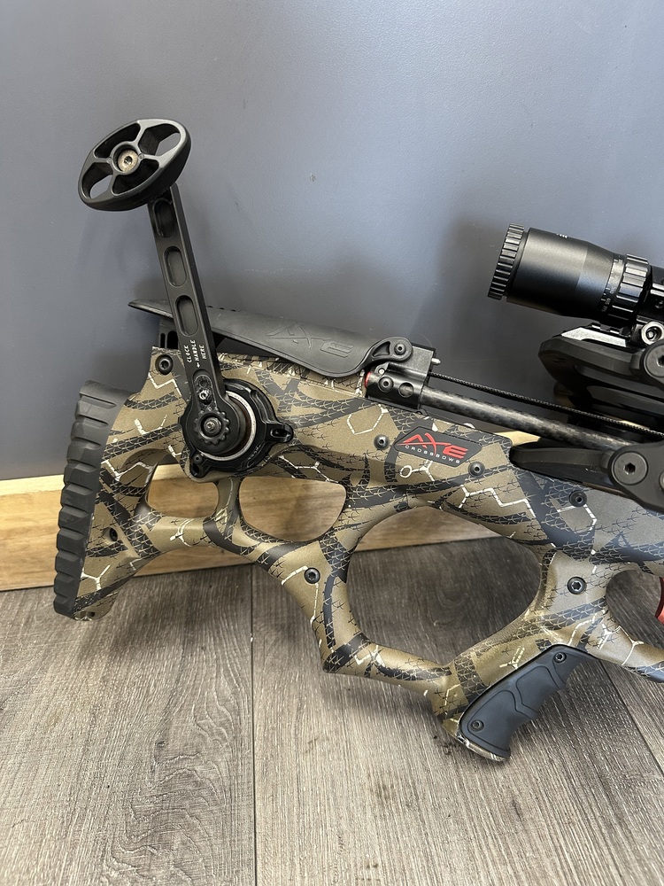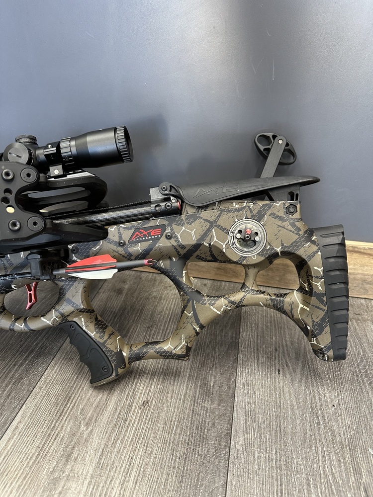 For sale, we have an Axe AX405 Crossbow Package with Scope. The crossbow is in good condition with some signs of use as shown in the pictures. Comes with 1 arrow. The scope is missing 2 of the adustment caps as shown in the pictures. If you have any questions before purchasing pleas elet us know. (134476)(CXX)