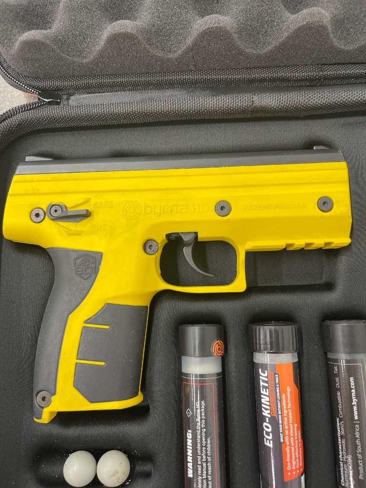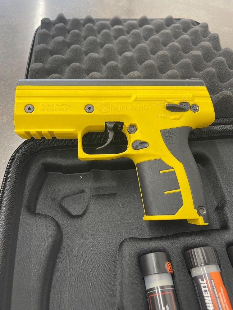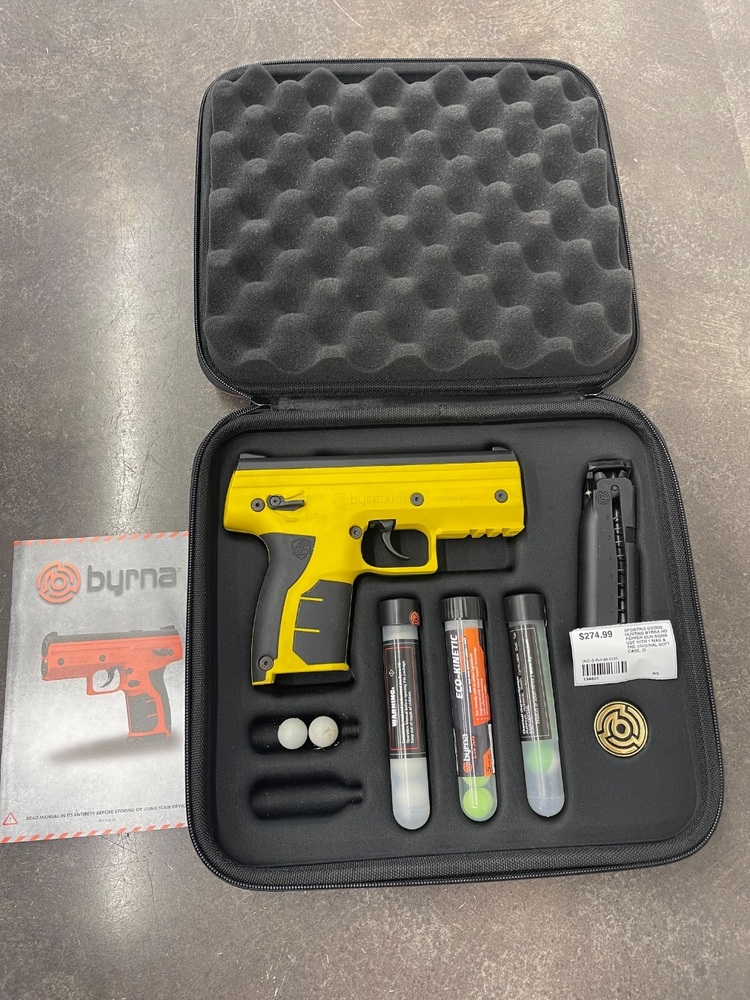 For sale we have a Byrna Pepper Gun in good condition, with some marks and scuffs from every day use as shown in pictures. Comes with pepper rounds, and original case, does not include the C02 tanks. If you have any questions before purchasing please let us know.