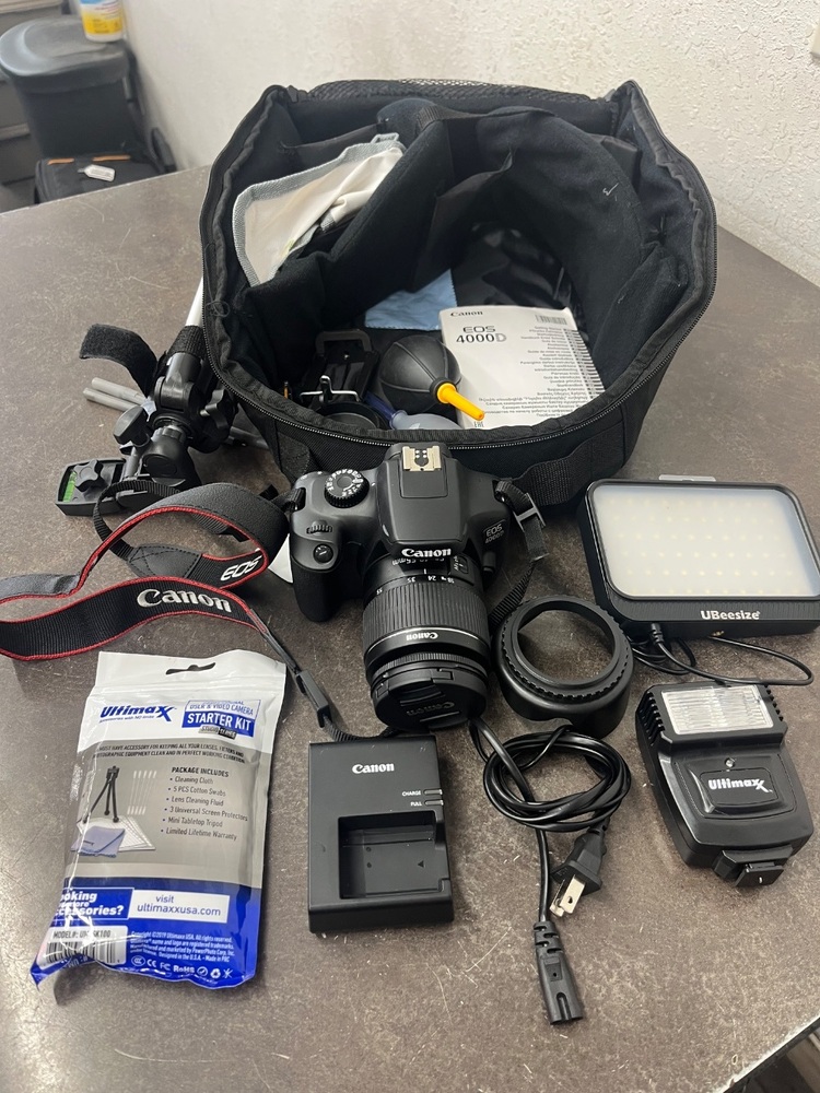 FOR SALE IS A CANON EOS 4000D DIGITAL CAMERA STARTER KIT WITH TRIIPOD AND BACKPACK.