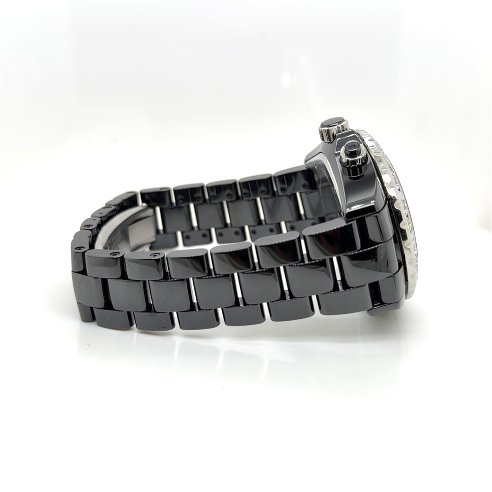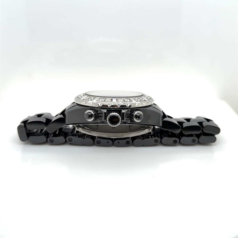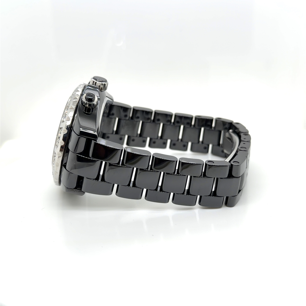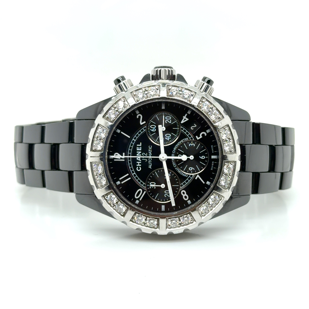 For sale, we have a Chanel J12 41mm H1178 Diamond Bezel, Automatic Chronograph (ETA 2894-2), Black Ceramic. With the Original Box & Pillow as shown in the last picture. No Paperwork. The total Diamond Carat weight is Approximately 1.20cttw. With all of the links the watch can fit up to a 7-Inch Wrist. The watch is in good condition with some marks and scratches on the bezel & back of watch from use as shown in the pictures. If you have any questions before purchasing please let us know. (140639)(RSXX)