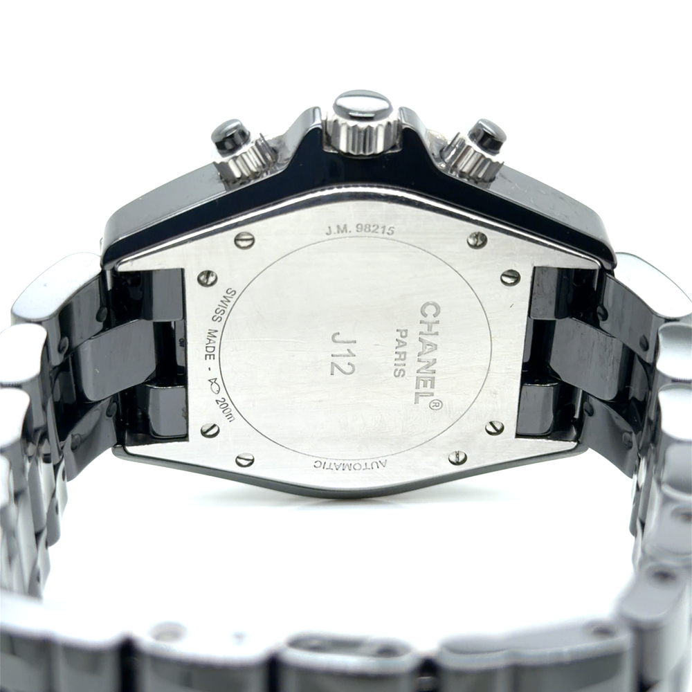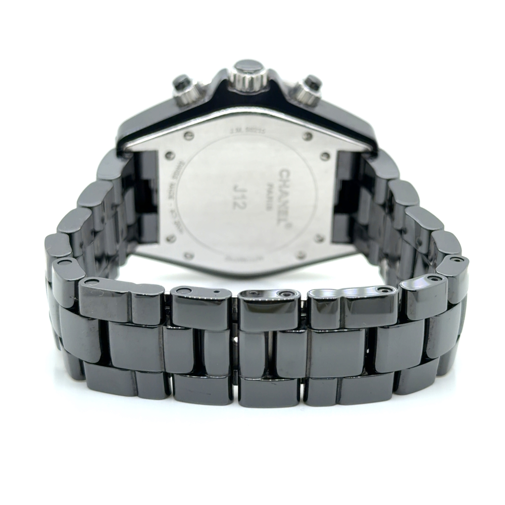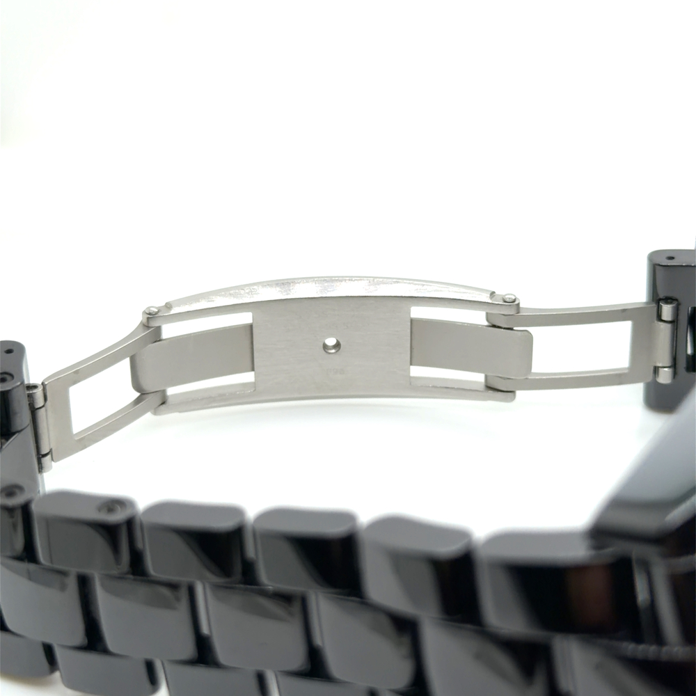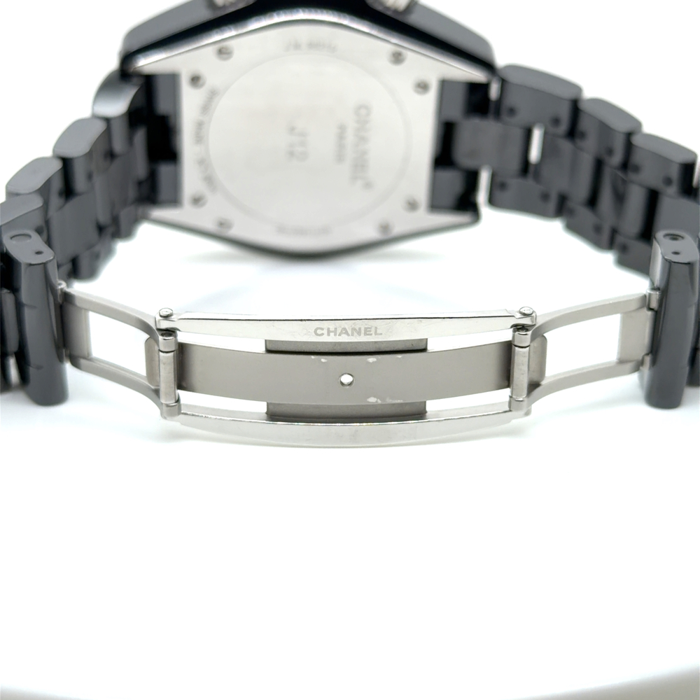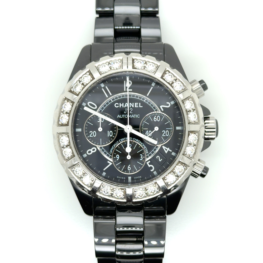 For sale, we have a Chanel J12 41mm H1178 Diamond Bezel, Automatic Chronograph (ETA 2894-2), Black Ceramic. With the Original Box & Pillow as shown in the last picture. No Paperwork. The total Diamond Carat weight is Approximately 1.20cttw. With all of the links the watch can fit up to a 7-Inch Wrist. The watch is in good condition with some marks and scratches on the bezel & back of watch from use as shown in the pictures. If you have any questions before purchasing please let us know. (140639)(RSXX)