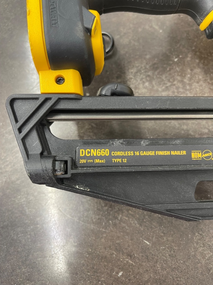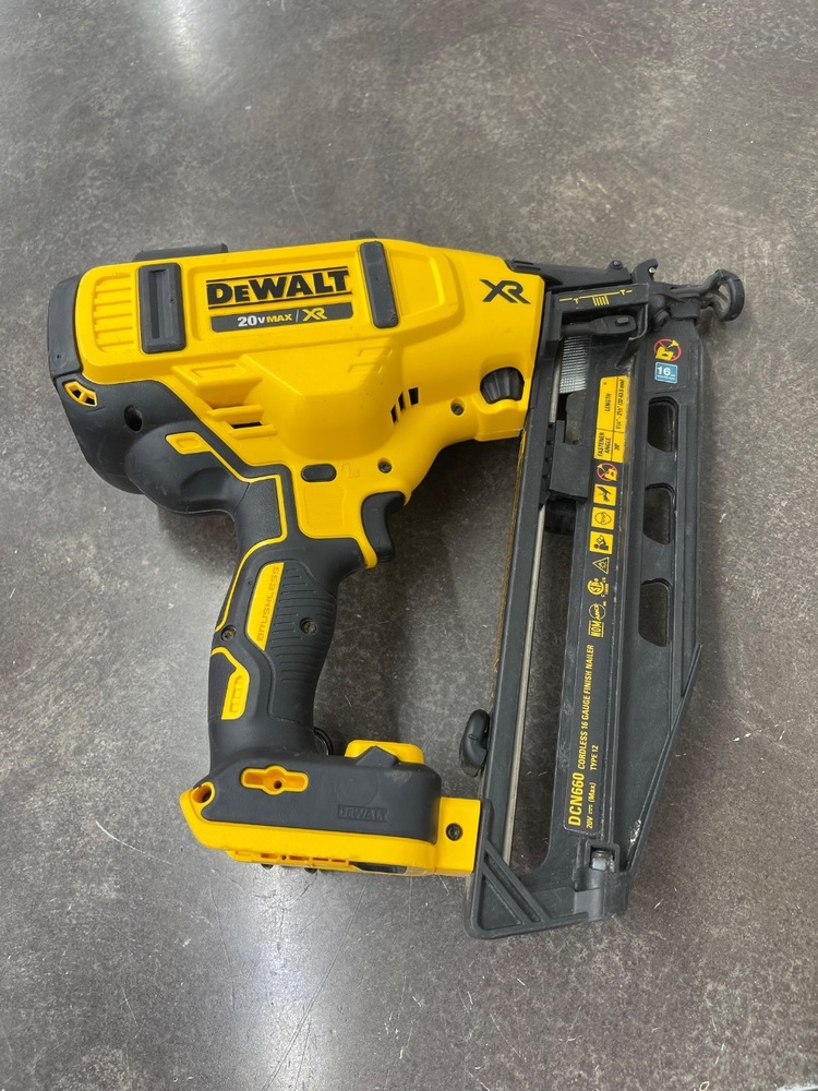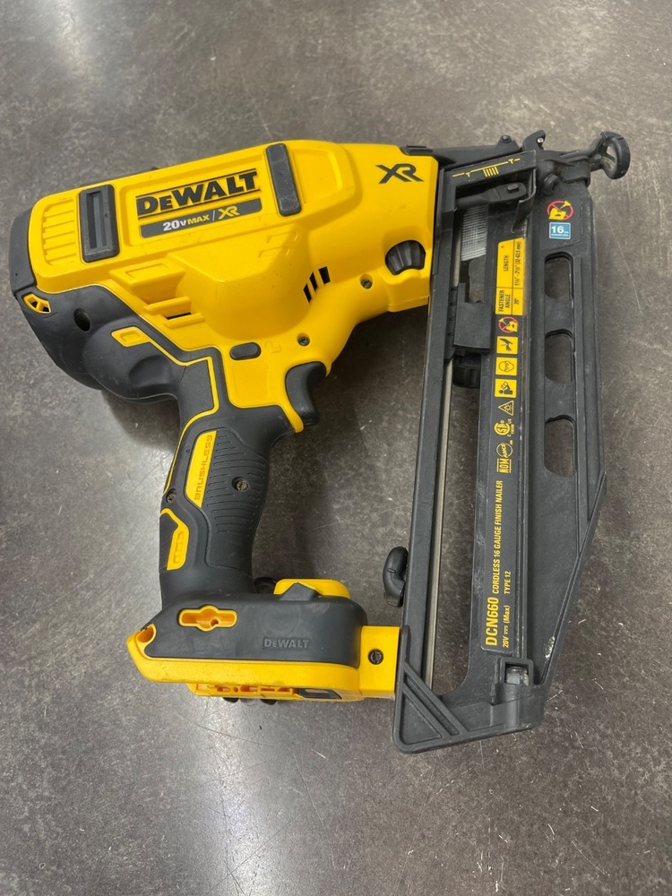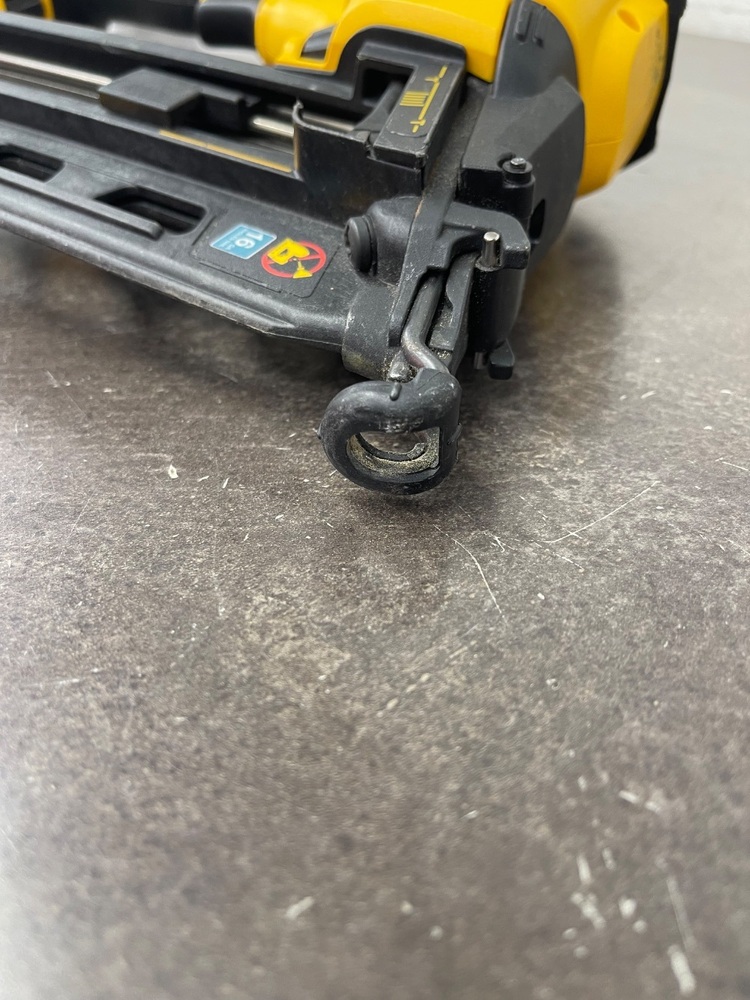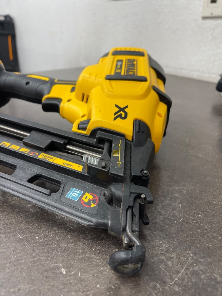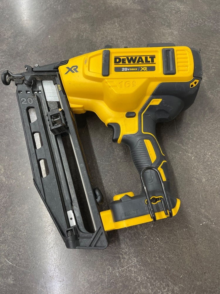 For sale we have a Dewalt 20V 16 gauge angled nailer in good condition, with some marks and scuffs from every day use as shown in pictures. Tool only, no battery or charger. If you have any questions before purchasing please let us know.