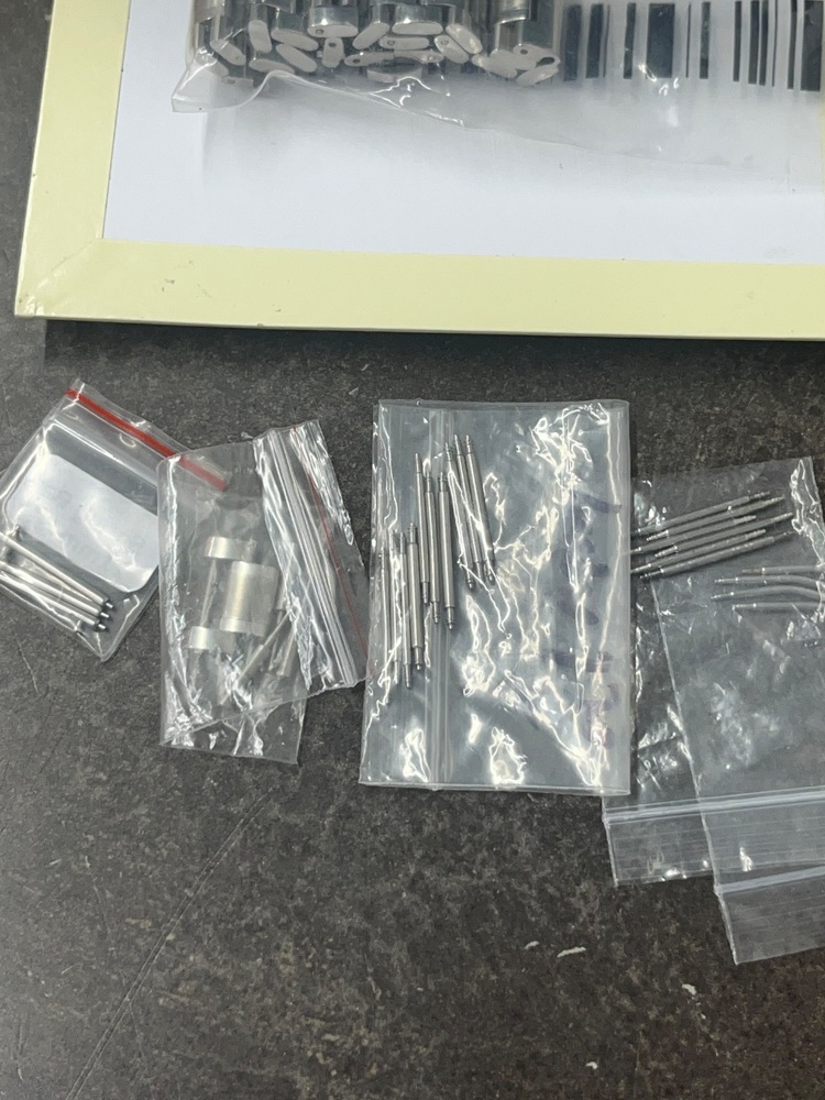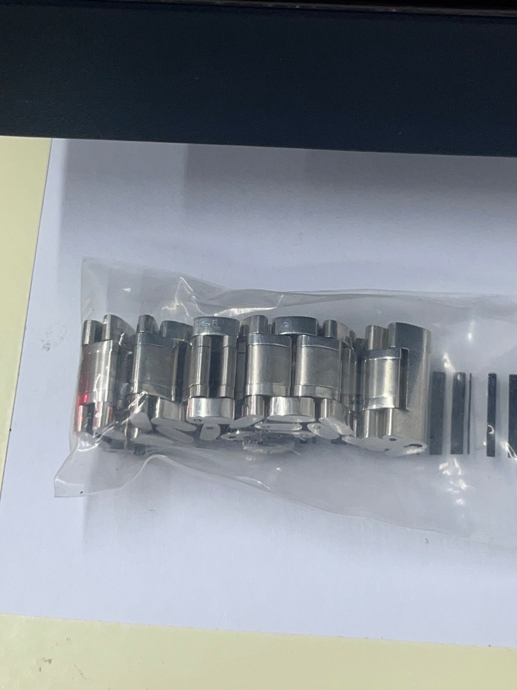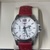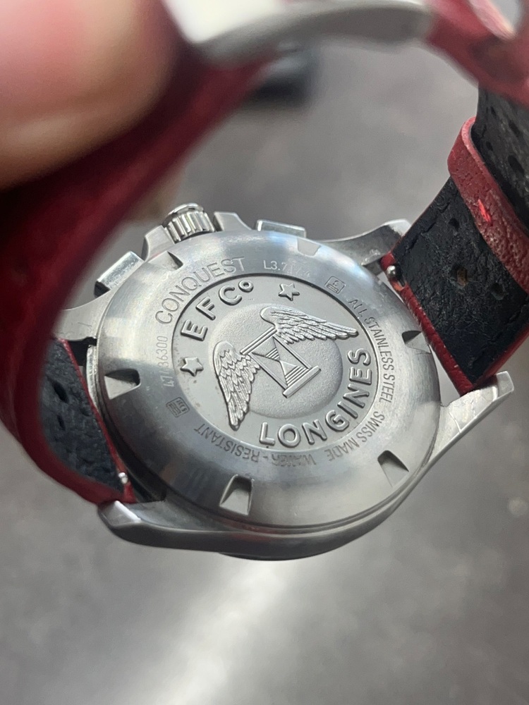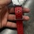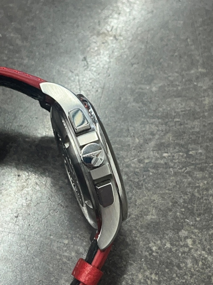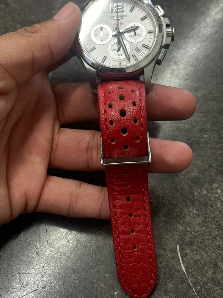 IT COMES WITH RED LEATHER BAND AND AN AFTERMARKET STAINLESS STEEL BAND.