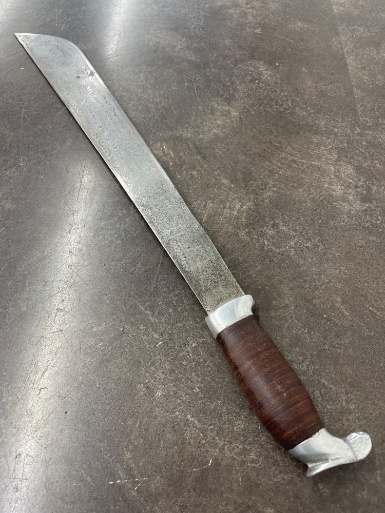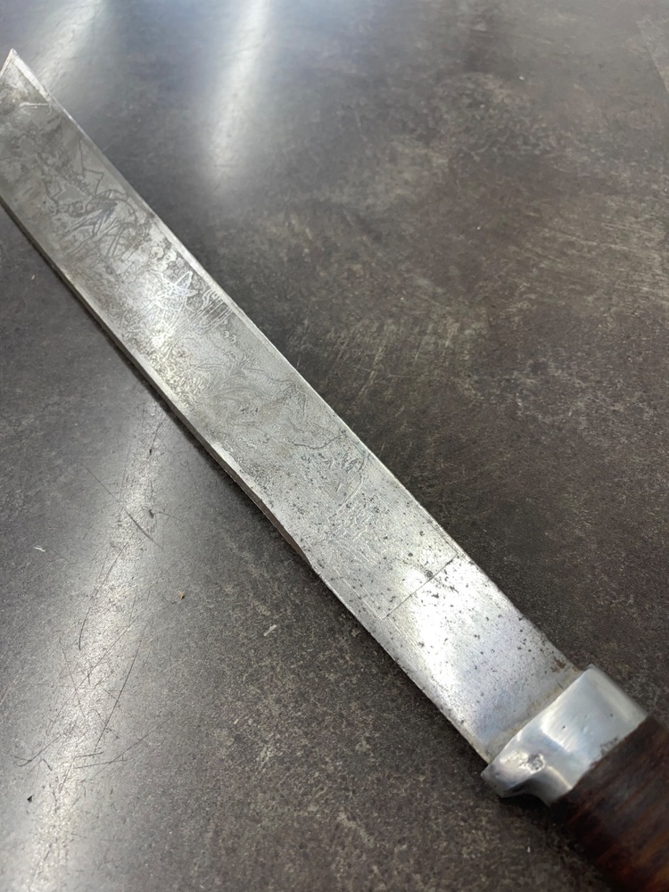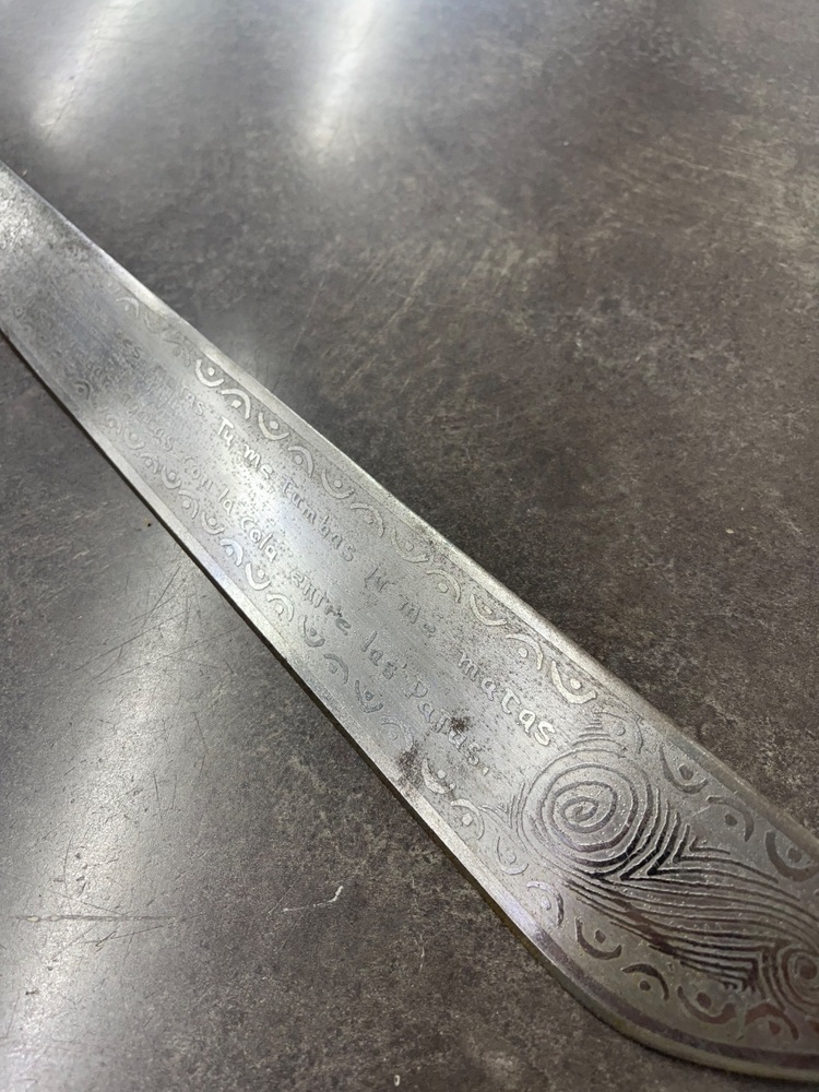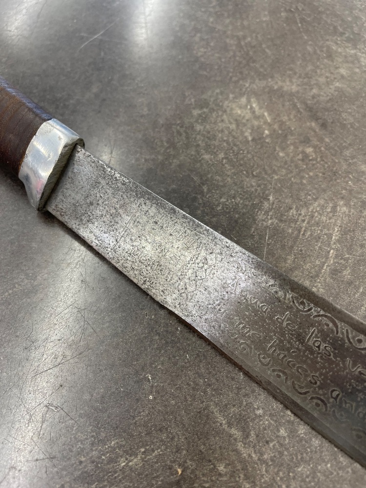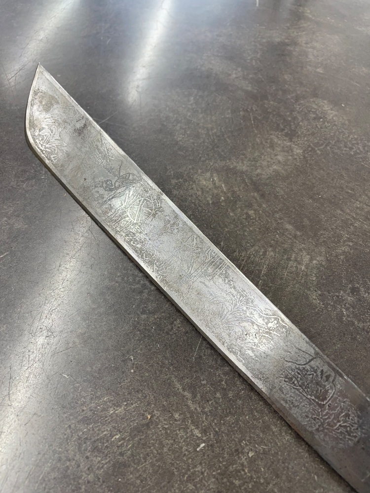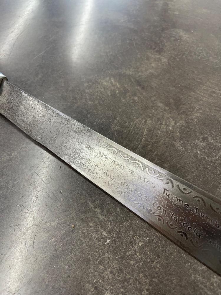 For sale is a Mexico engraved machete with an 18' blade. The blade has an angraved scene on one side. The other side has some words engraved on it. Please see the pictures for more details.