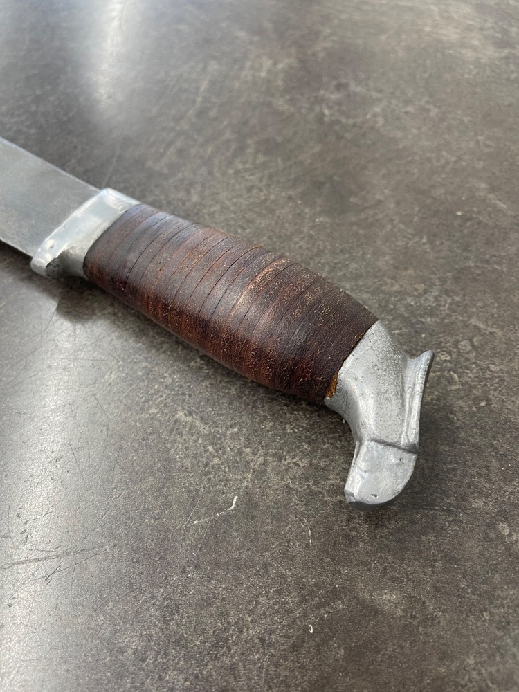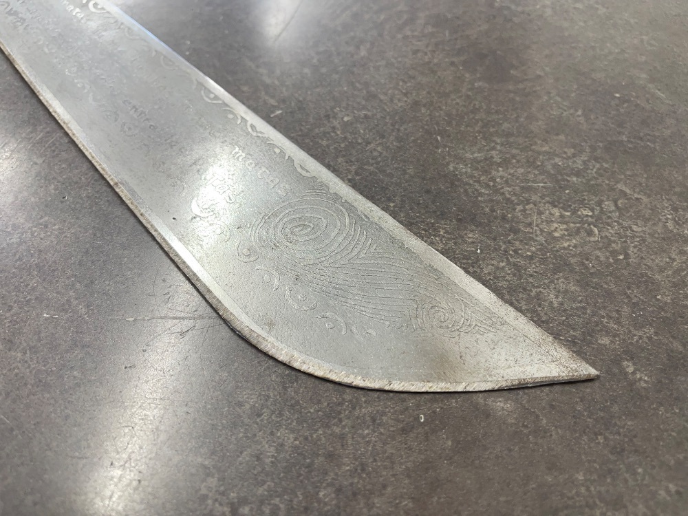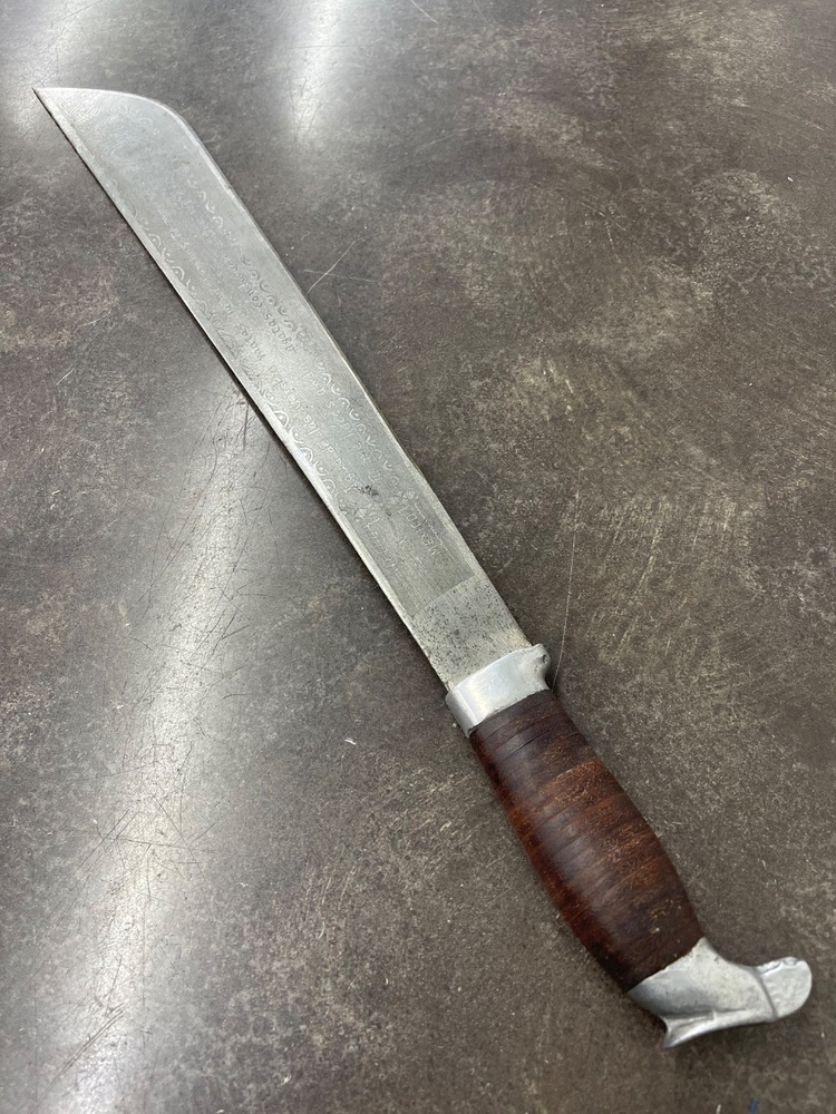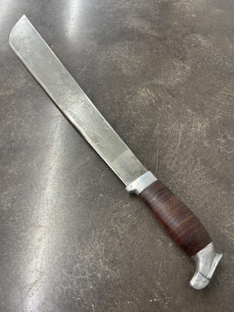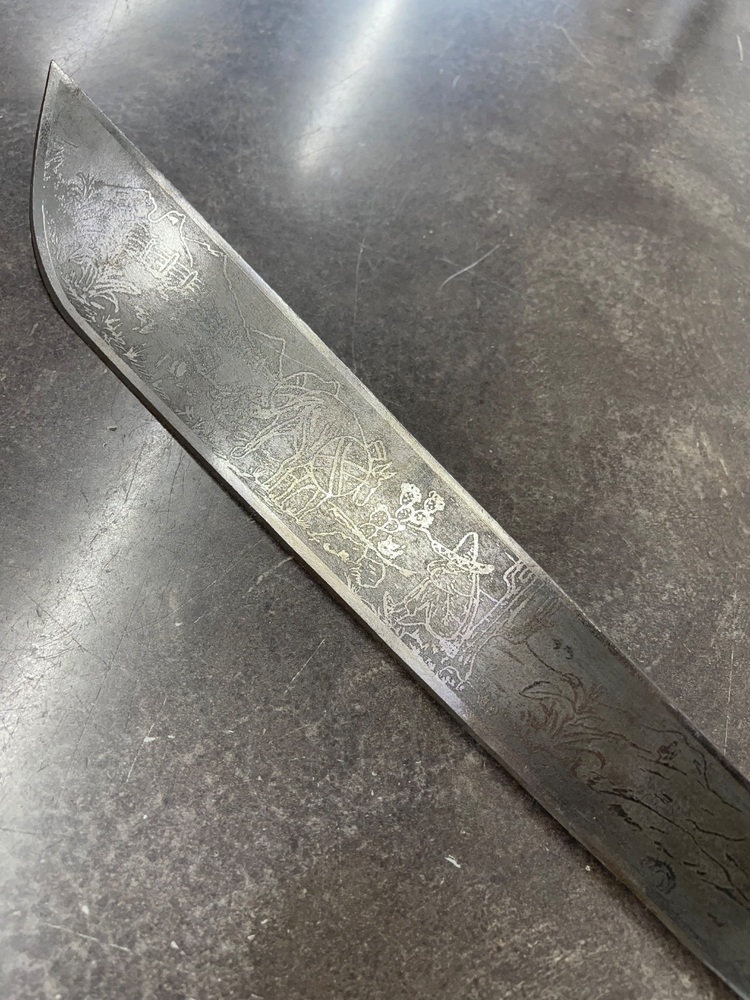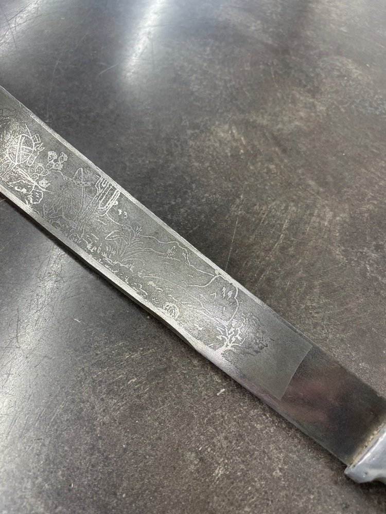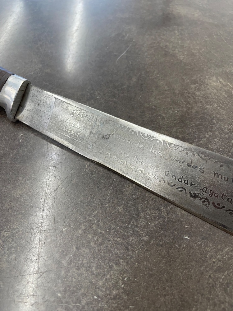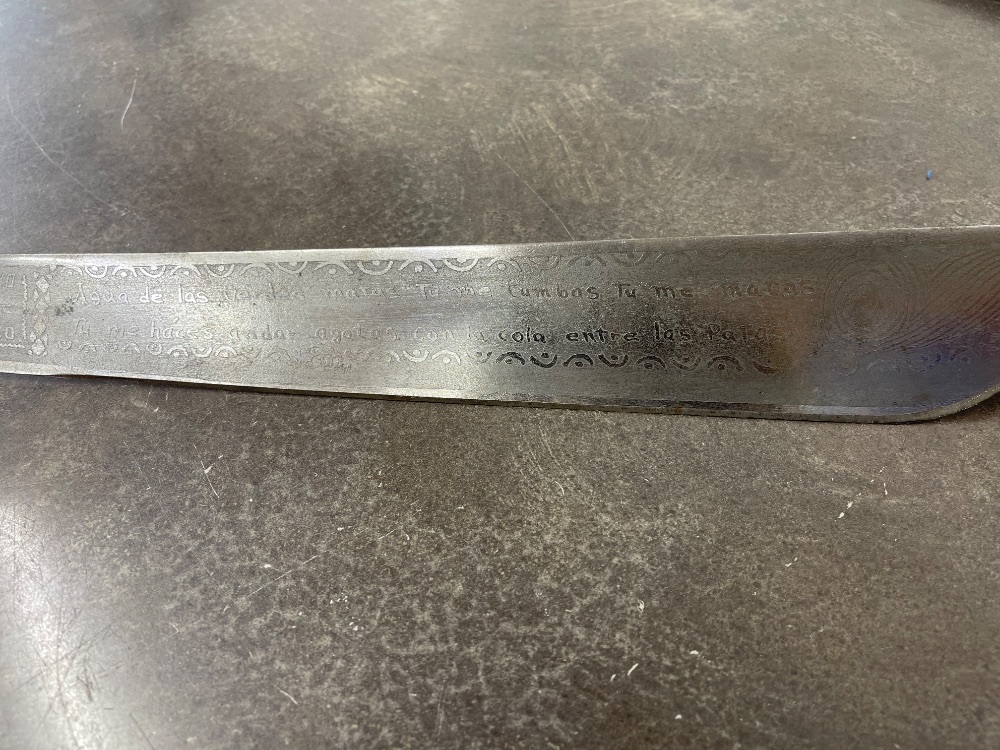 For sale is a Mexico engraved machete with an 18" blade. The blade has an angraved scene on one side. The other side has some words engraved on it. Please see the pictures for more details.