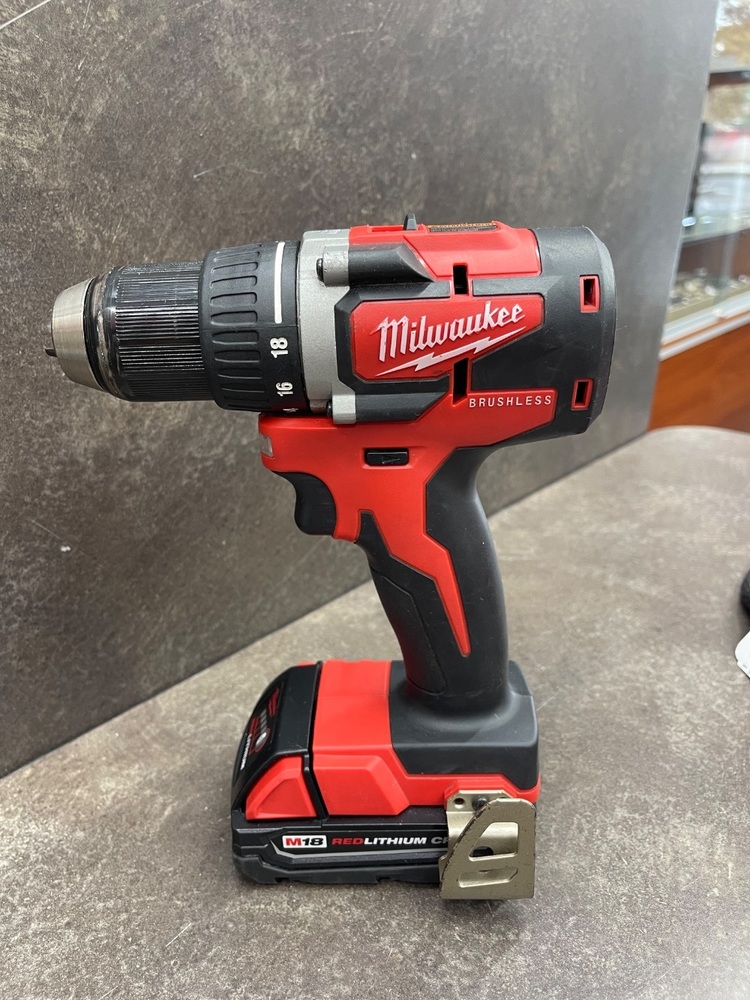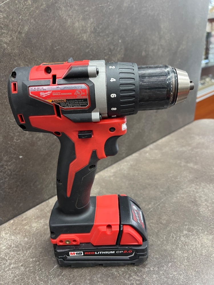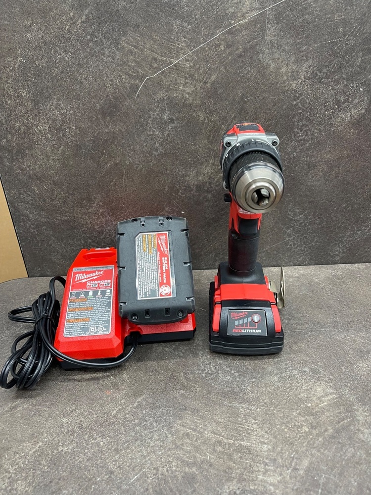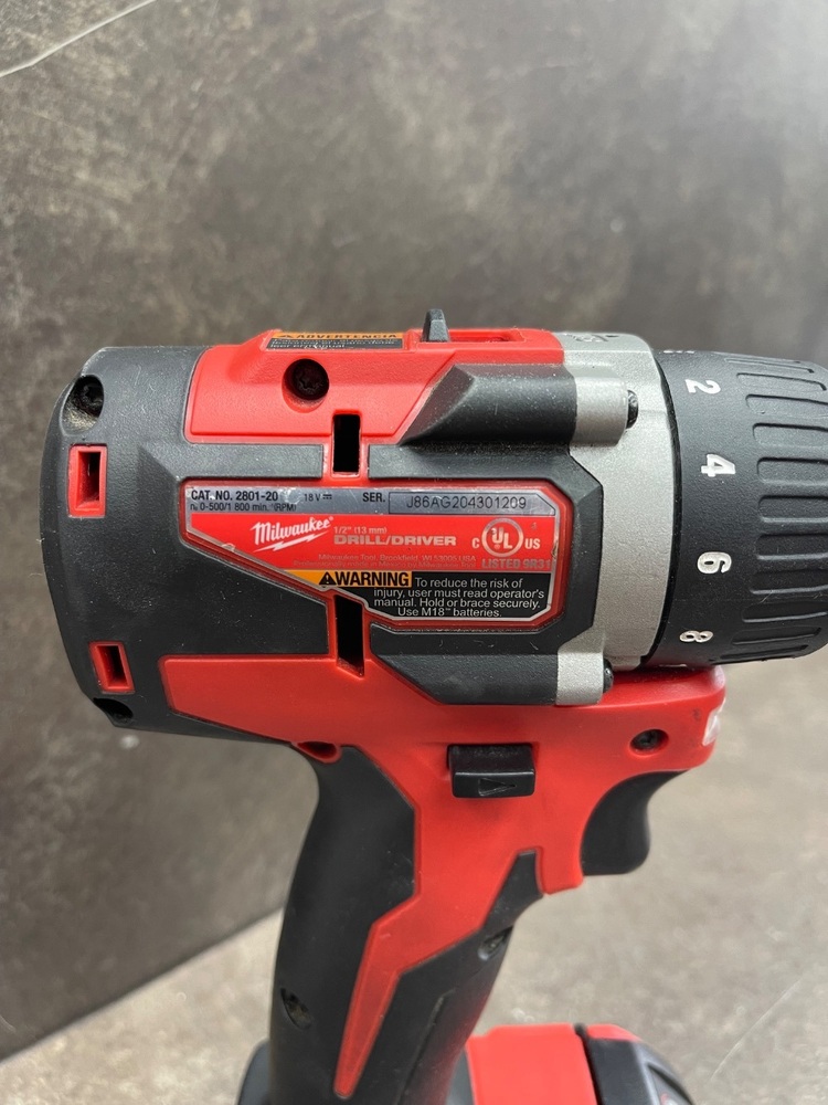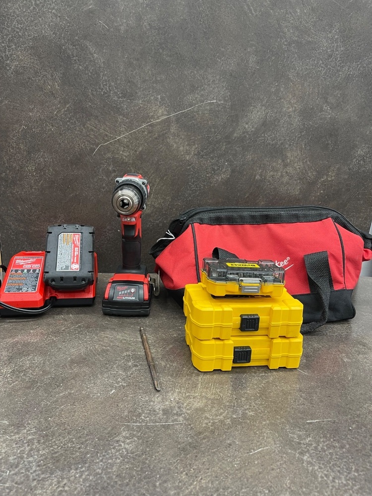 For sale we have a Milwaukee 1/2" Drill set in good condition, with some marks and scuffs from every day use as shown in pictures. Comes with 2 original batteries, 1 charger, bits, and soft bag, if you have any questions before purchasing please let us know.