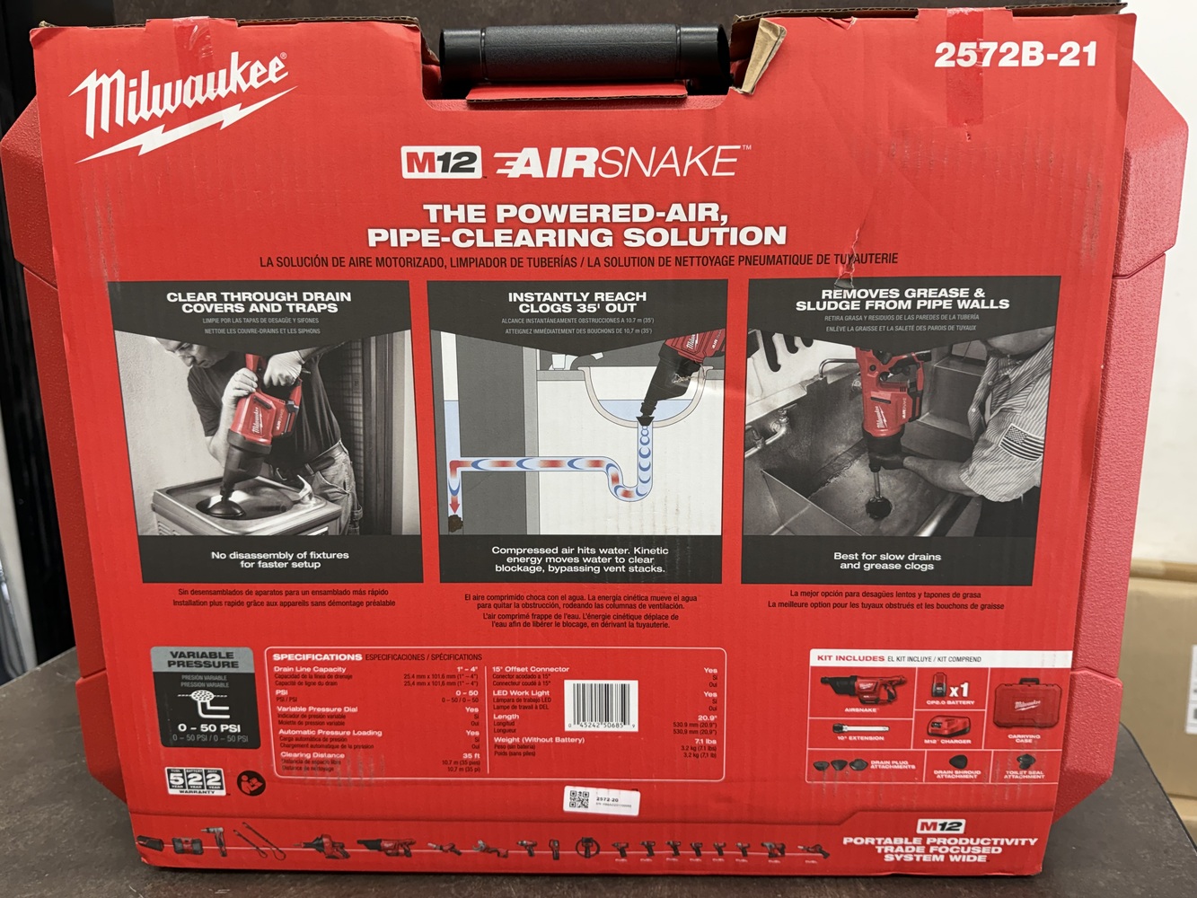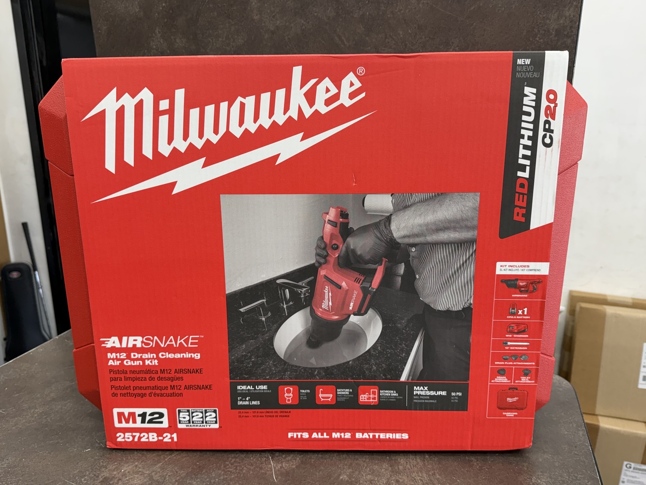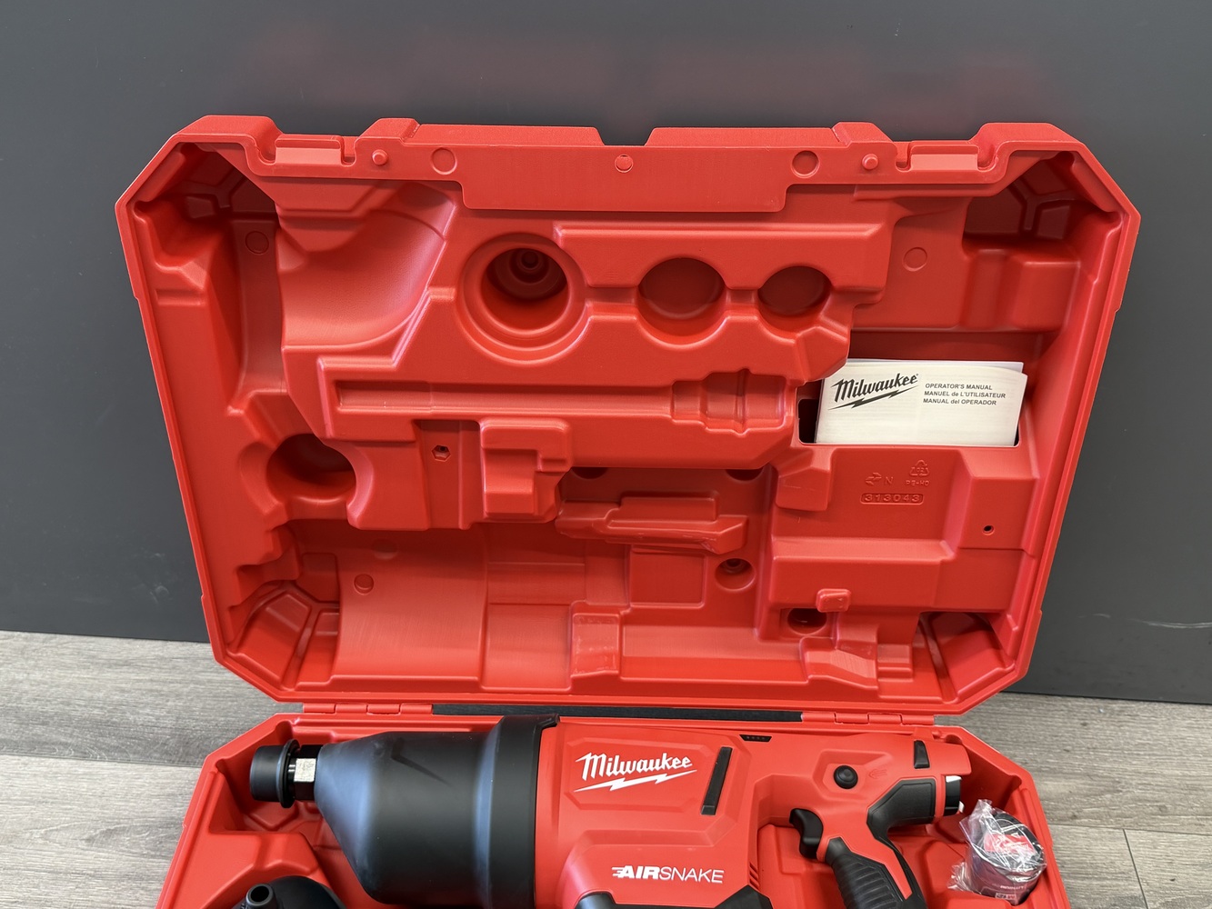 For sale, we have a Milwaukee 2572B-21 Air Snake M12 Drain Cleaning Air Gun Kit. New in the Original Hard Case. If you have any questions before purchasing please let us know. (136802)(RSX)