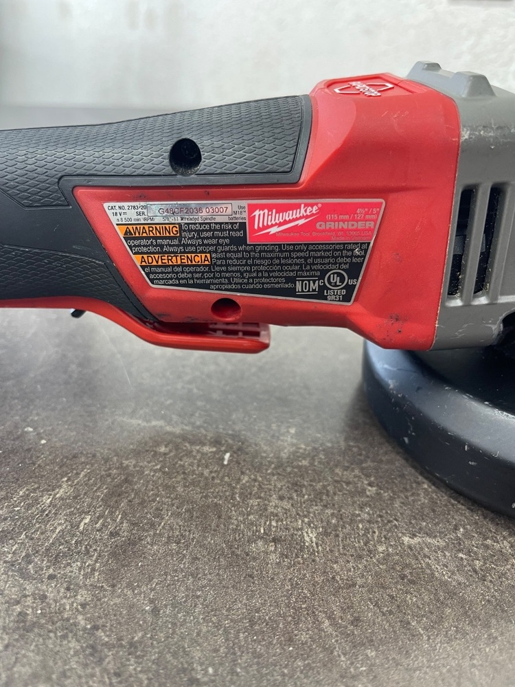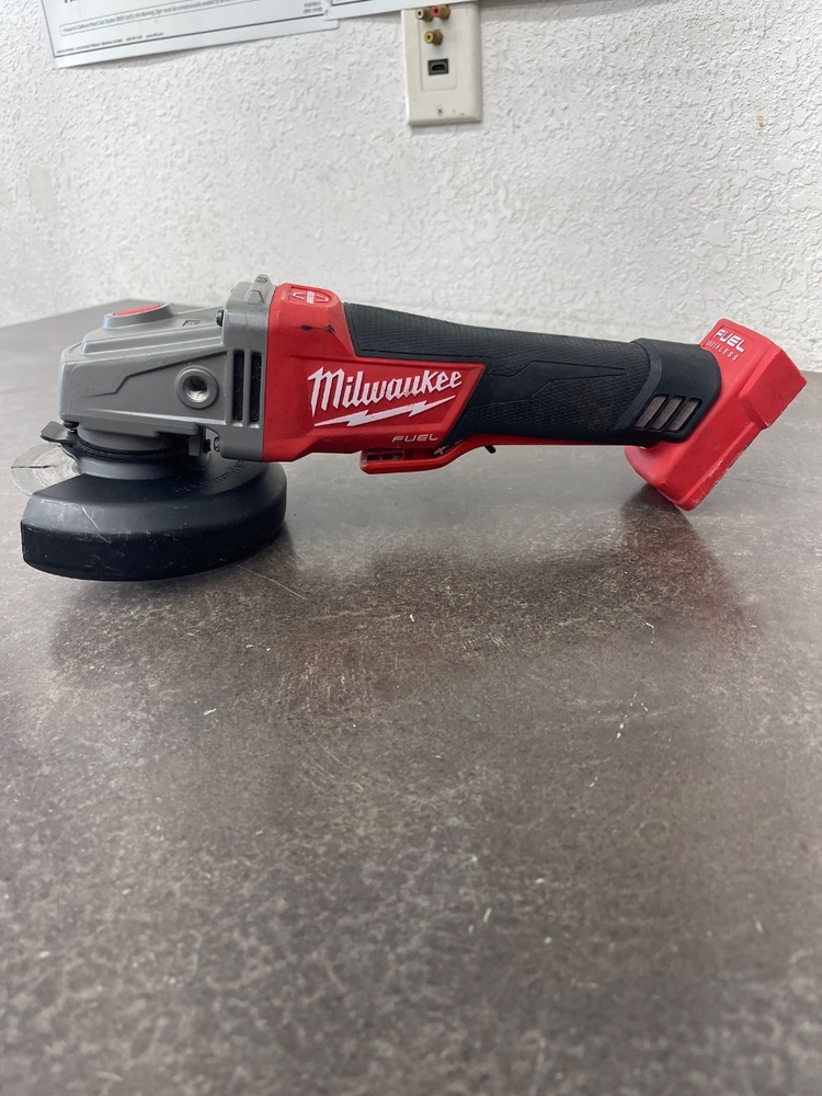 For sale we have a Milwaukee Braking Grinder in good condition, with some marks and scuffs from every day use as shown in pictures. Tool only, no battery or charger, if you have any questions before purchasing please let us know.