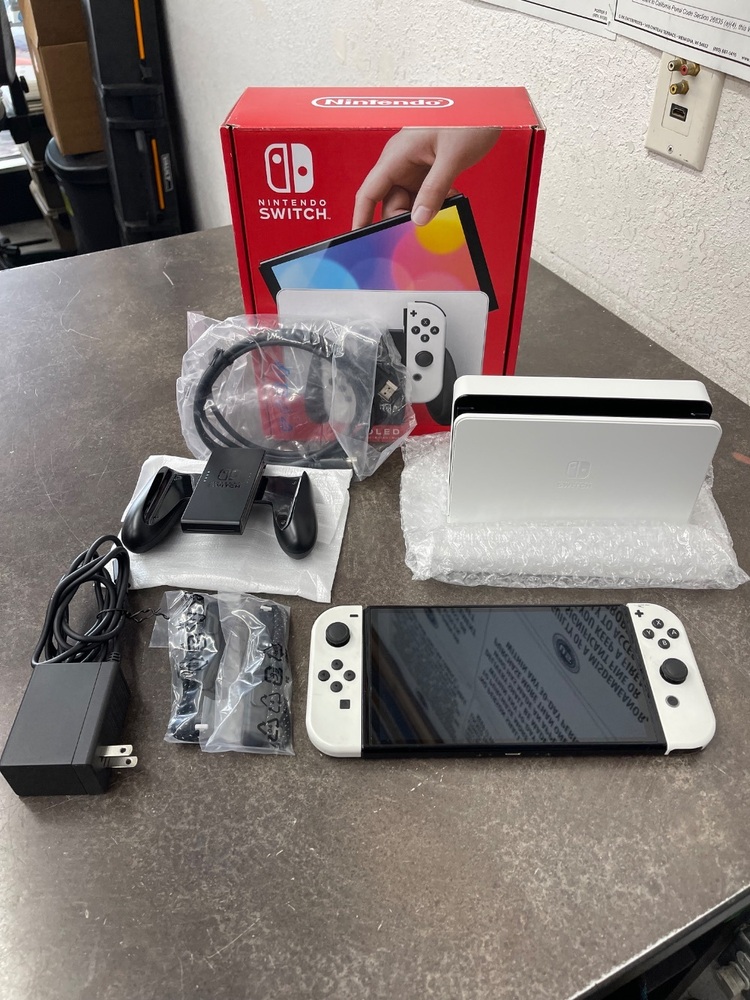 For sale we have a Nintendo Switch OLED model in good condition, with marks and scuffs from every day use as shown in pictures. Comes with original box, dock, cable and other accessories shown, if you have any questions before purchasing please let us know.