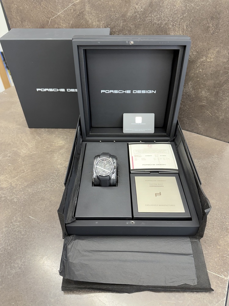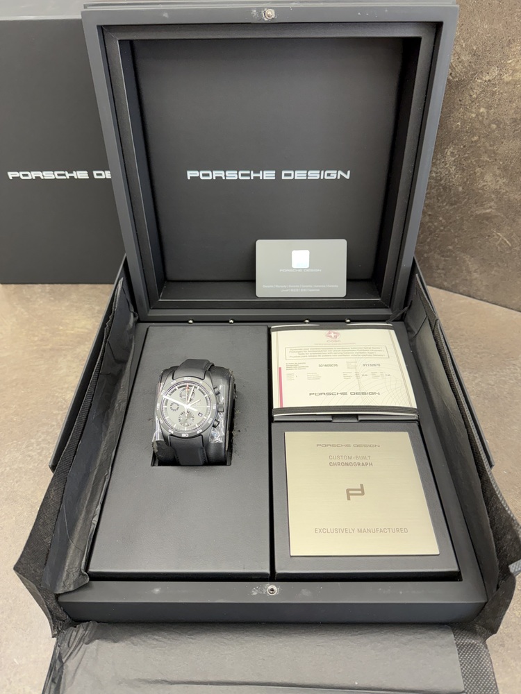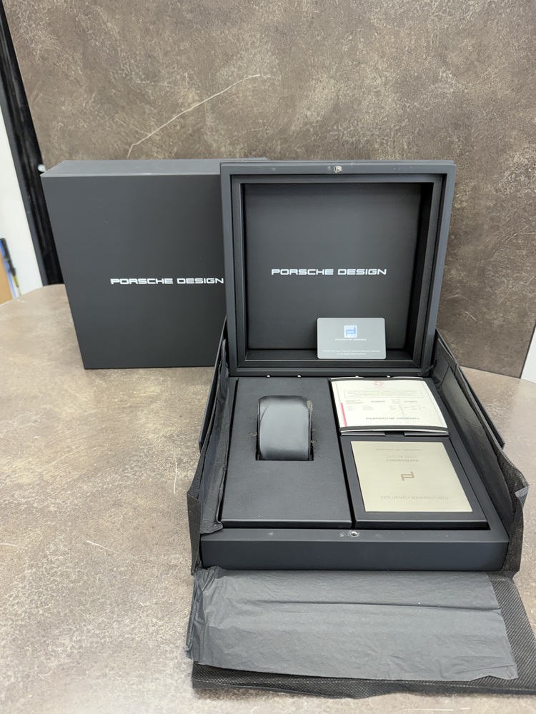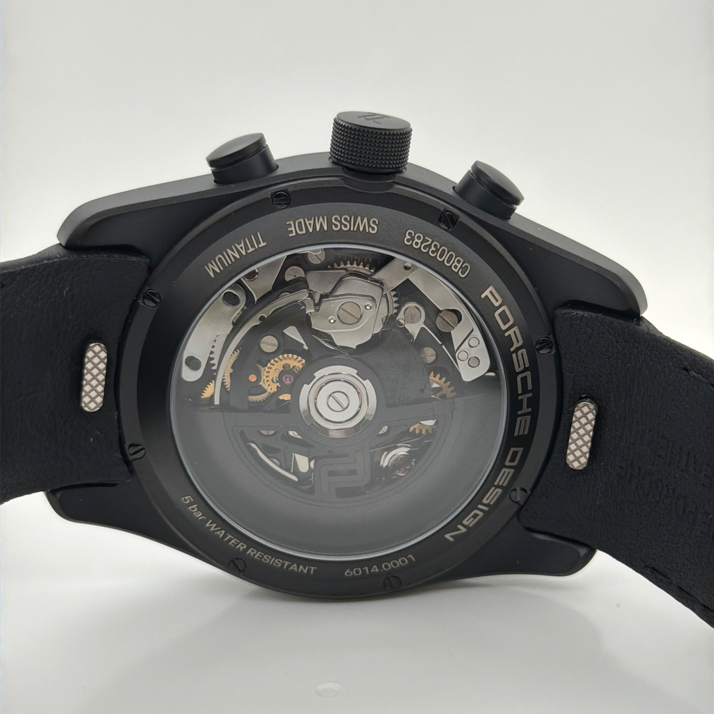 For sale, we have a Porsche Design Chronometer 6014.001 Black Titanium 42mm Automatic Men's Watch. The watch is in Unworn, New Condition. The inner display box does have some peeling as shown in the pictures. If you have any questions before purchasing pleae let us know. (141186)(RCXX)