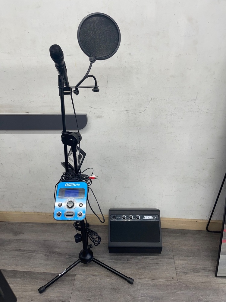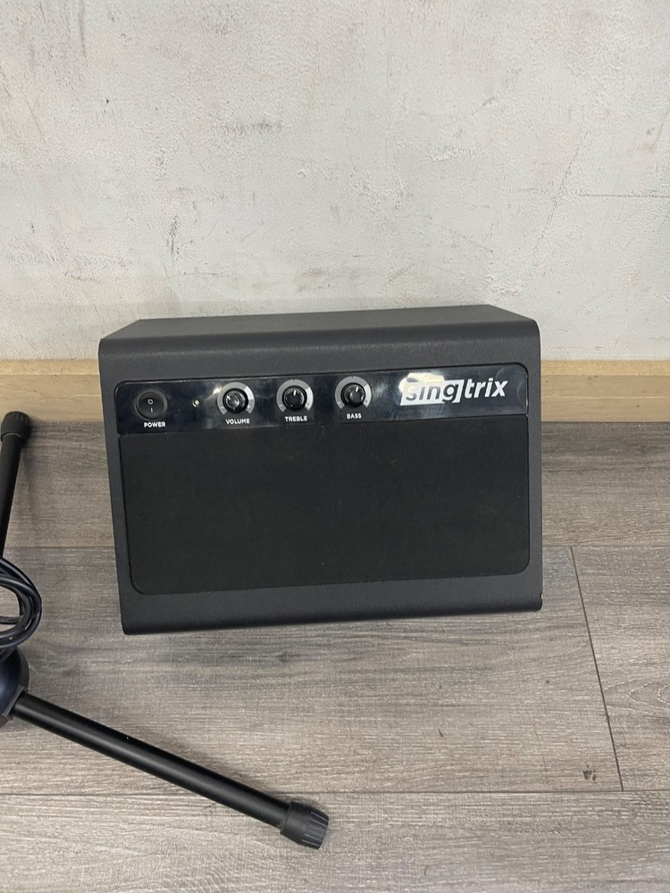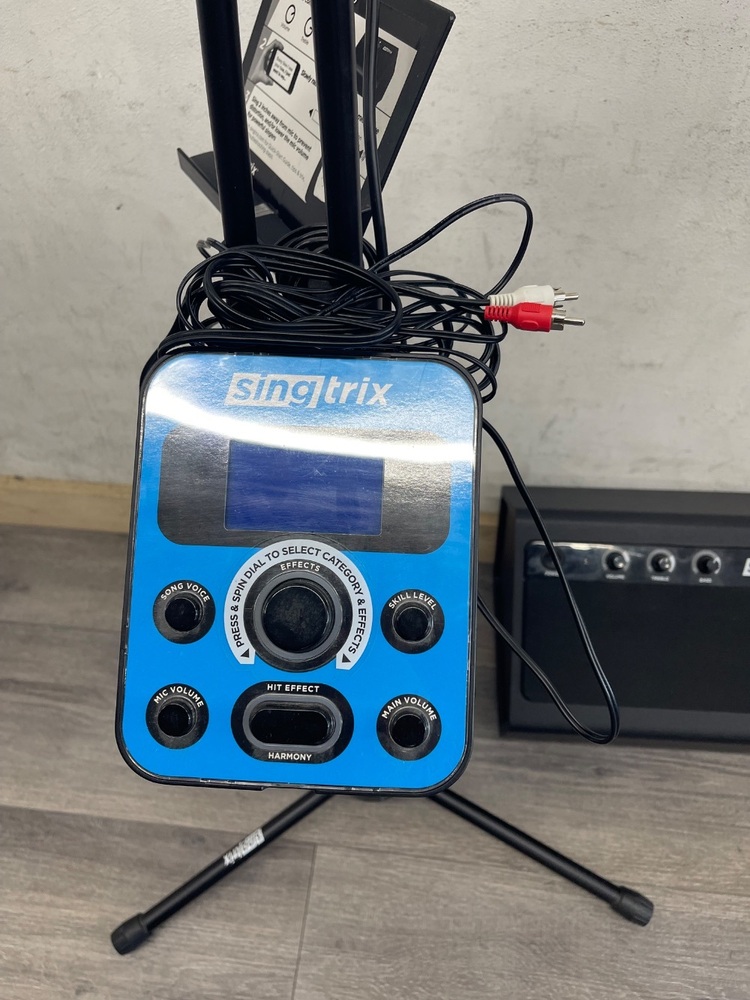 For sale we have a Sing Trix Karaoke machine in great condition, with some signs of use as shown in pictures. Comes with cables, microphone, and amp, if you have any questions before purchasing please let us know.