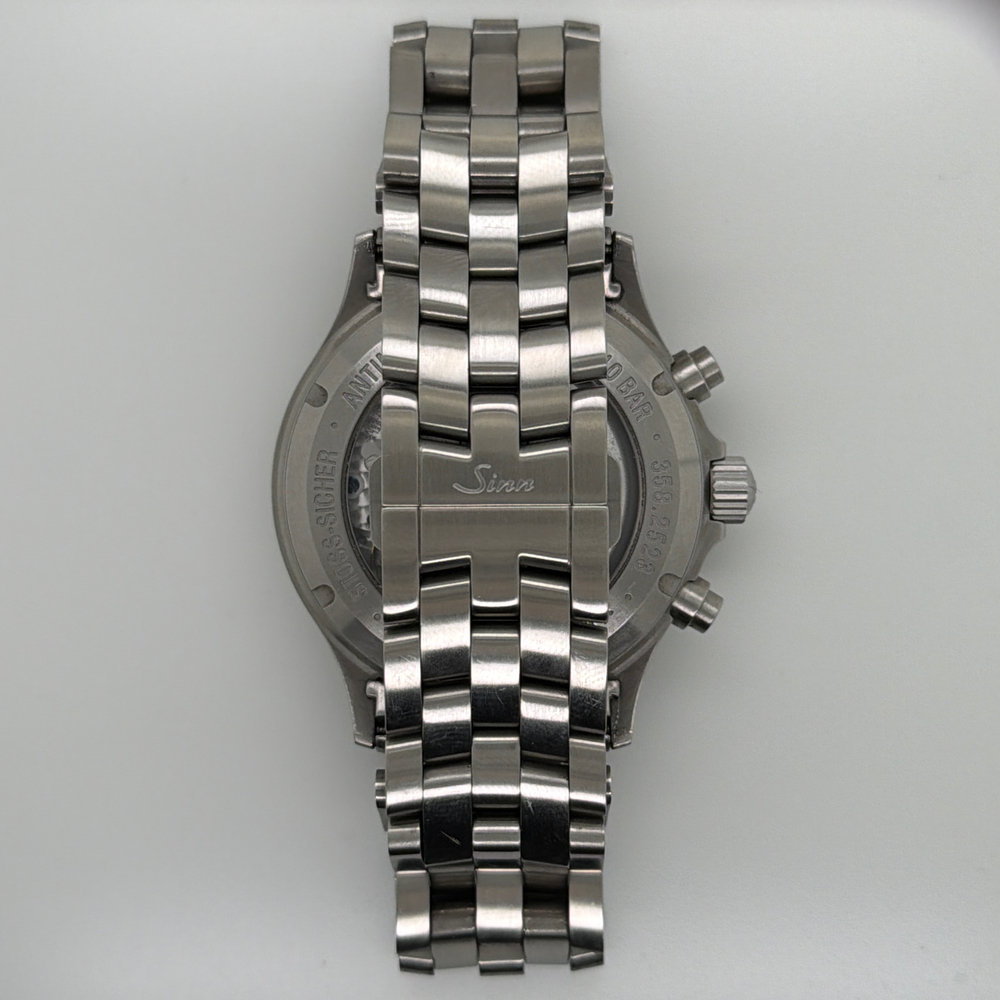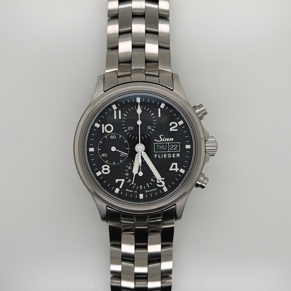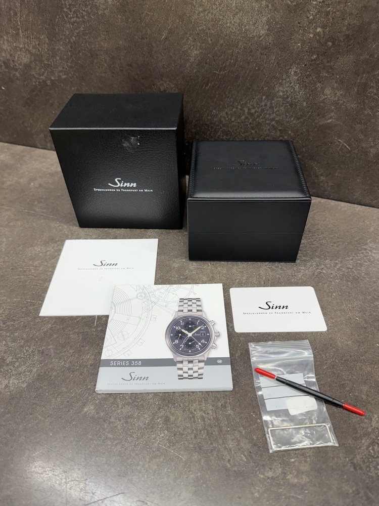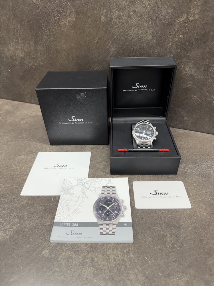 For sale, we have a Sinn 358.062 SA Flieger Chronograph 42mm Automatic Men's Watch. Comes with the Original Box, Paperwork, & Tools as pictured. The watch is in great condition with some light scratches and marks from use as shown in the pictures. With the current links, the watch can fit up to a 7" Wrist. If you have any questions before purchasing please let us know. (119064)(RRSX)