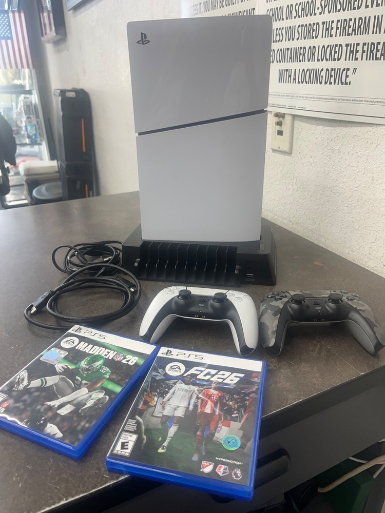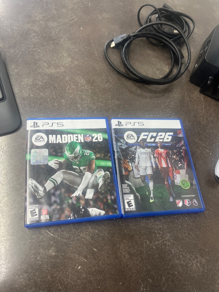 FOR SALE IS A SONY PS5 WITH FIFA 26 MADDEN 26 2 CONTROLLERS, HDMI, POWER CORD, USB-C CABLE COOLING STATION Loc:INVENTORY