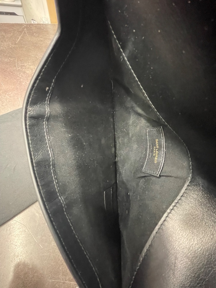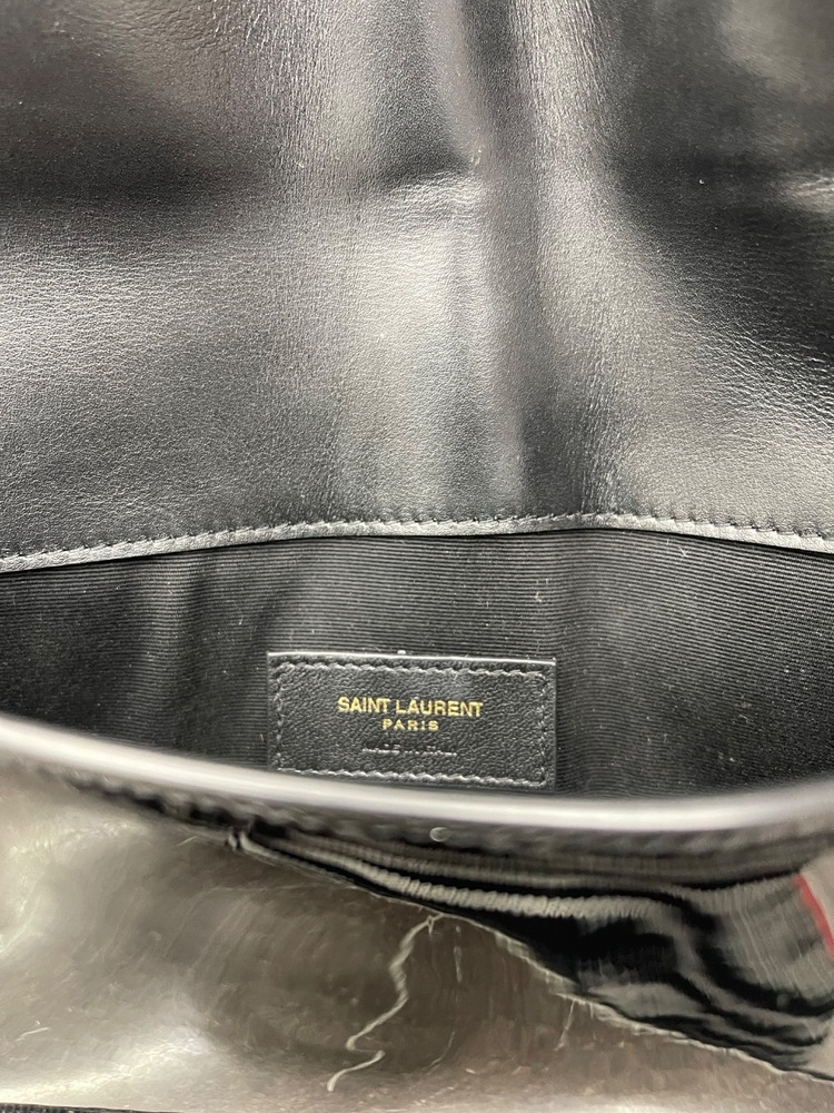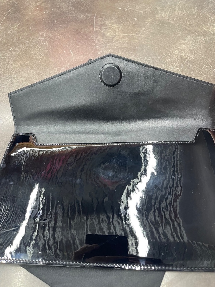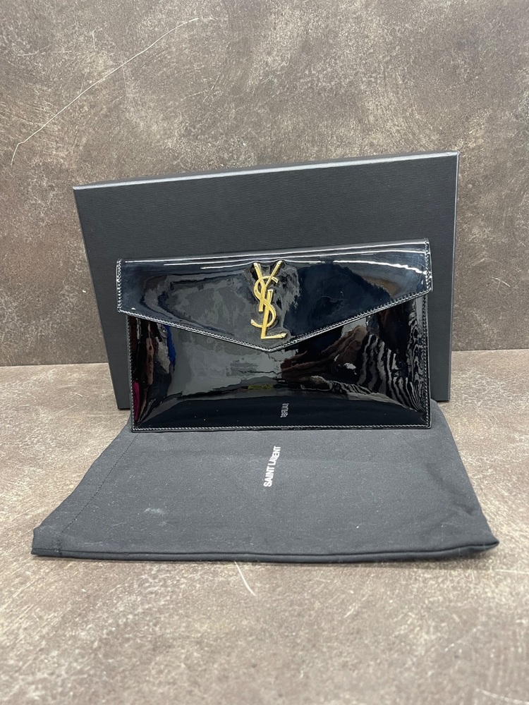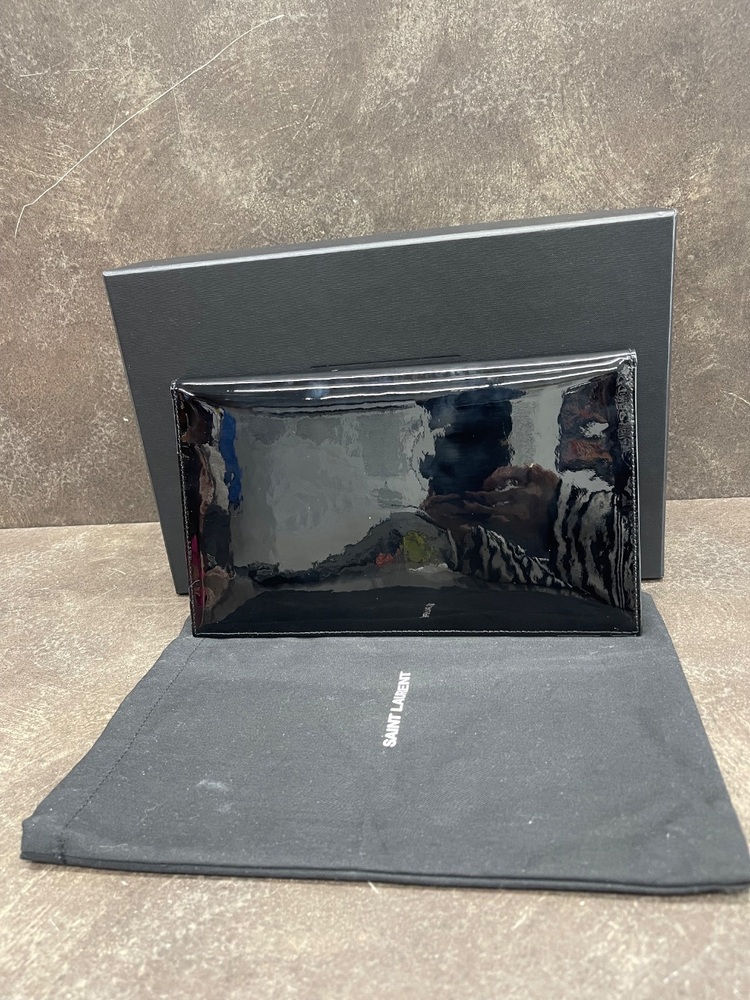 For sale is a YSL Uptown Pouch Patent Leather in a small envelope clutch style. The clutch is in black patent leather with a cotton interior lining and a magnetic closure. The listing comes with the original box, dustbag and ribbon. The clutch is in good condition.